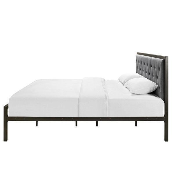 • King size Modern Metal Platform Bed with Gray Button Tufted Headboard